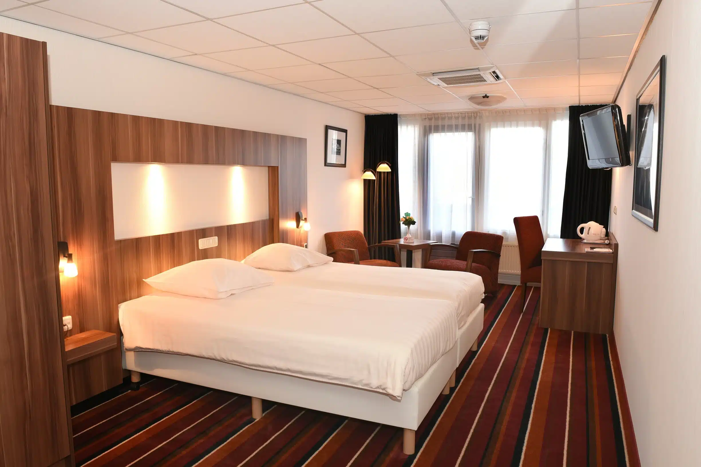 De Balkon Kamer is ruim opgezet en biedt u de mogelijkheid om extra te genieten van de frisse buitenlucht. U beschikt over twee comfortabele bedden, een bureau en een zithoek met koffie- en theefaciliteiten. De moderne badkamer is uitgerust met douche, toilet en luxe gastenartikelen. Dankzij de digitale televisie en airconditioning geniet u van optimaal comfort. Een aantal kamers beschikt over extra lange bedden (210 cm) en twee kamers hebben in plaats van een balkon een terras met buitenzitje op de begane grond.